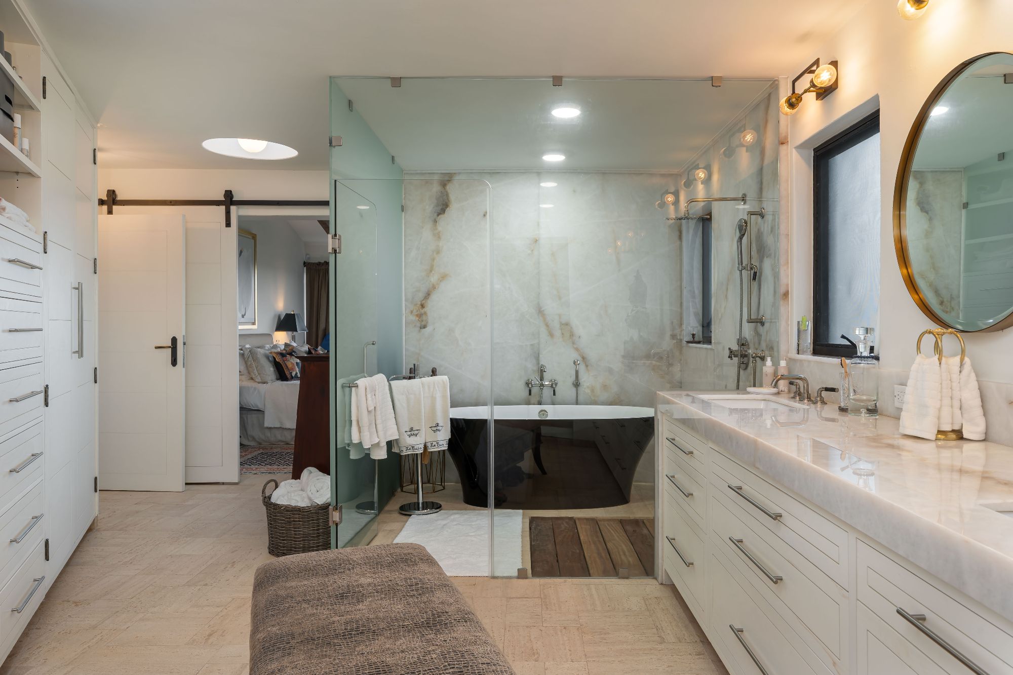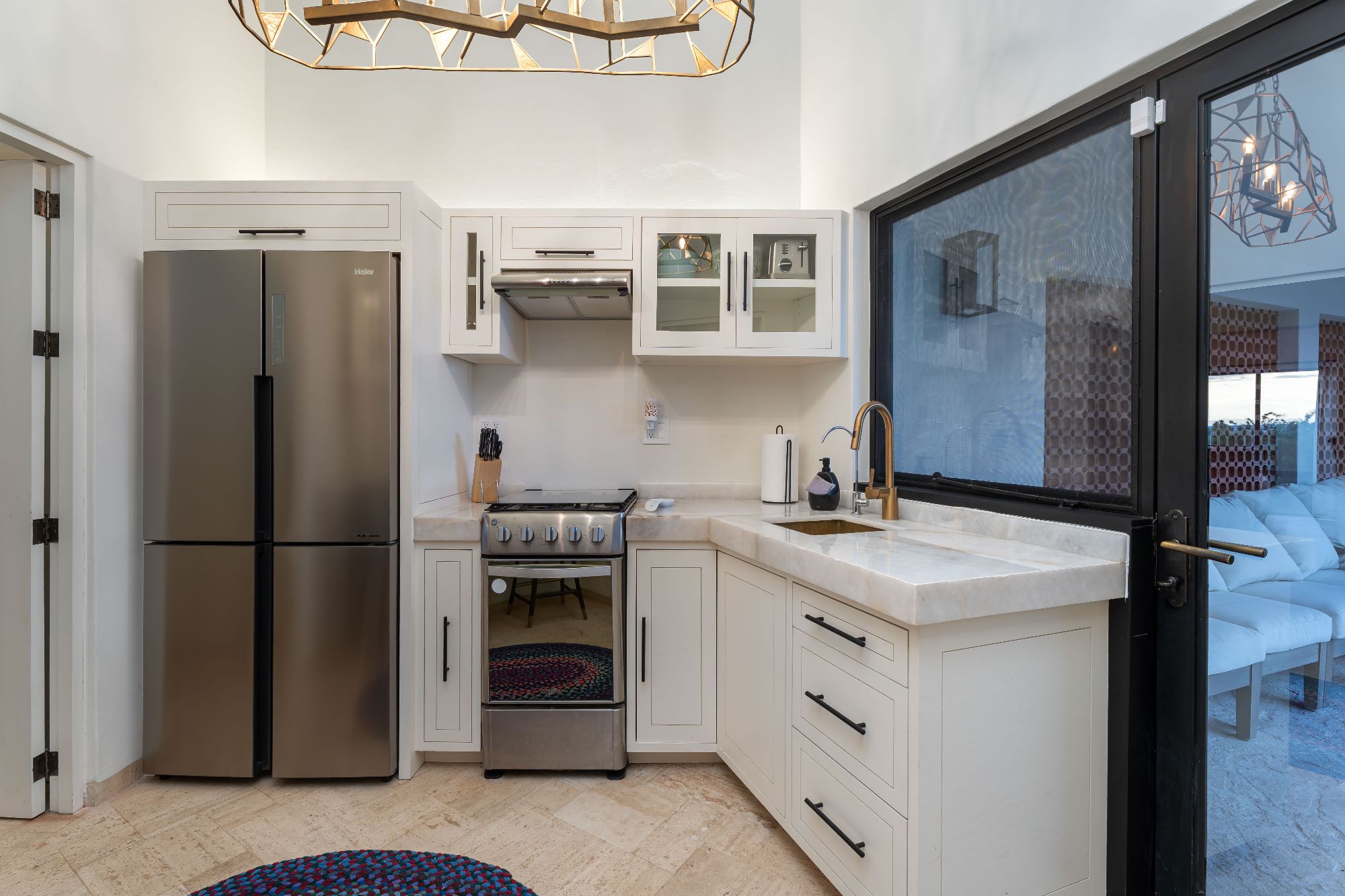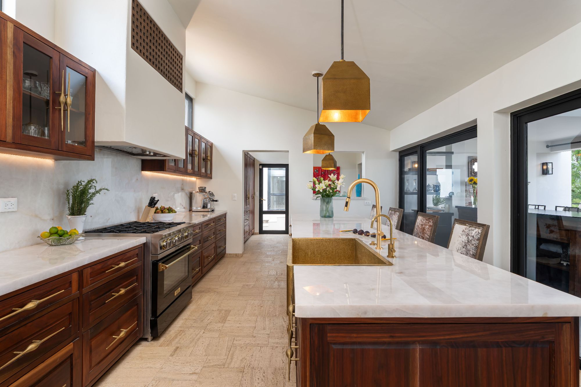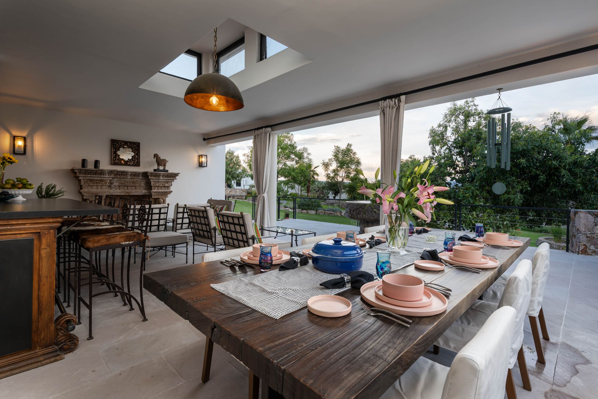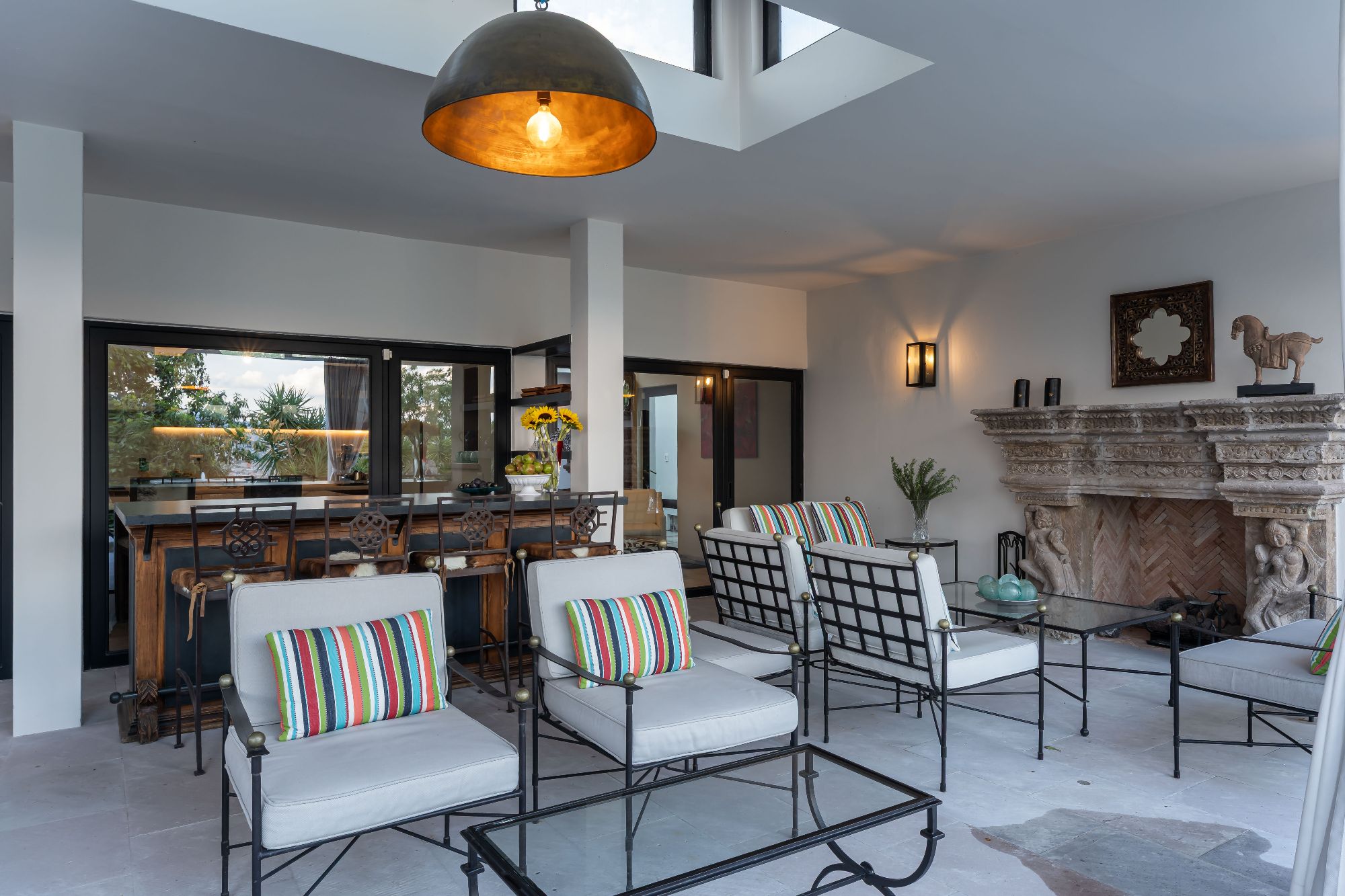 • Elegant Main Residence with 5 bedrooms and 6 bathrooms, stone flooring, custom handcrafted lighting, multiple fireplaces, and cantera stone details.