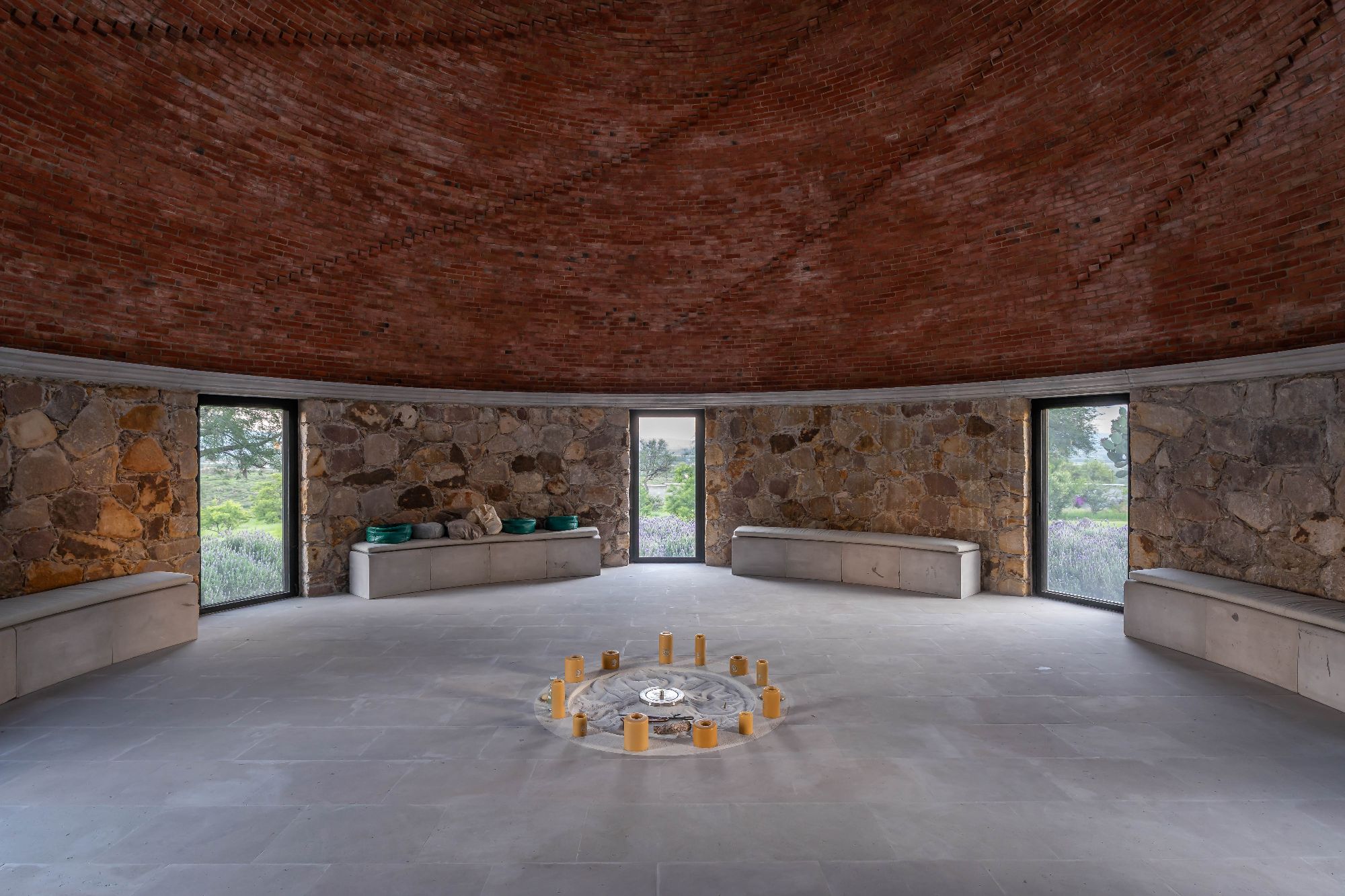 30’ stone dome pavilion with cantera floors, fire pit, and fountain, plus covered patios, bar, and outdoor kitchens.
