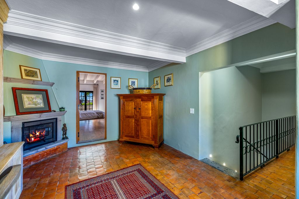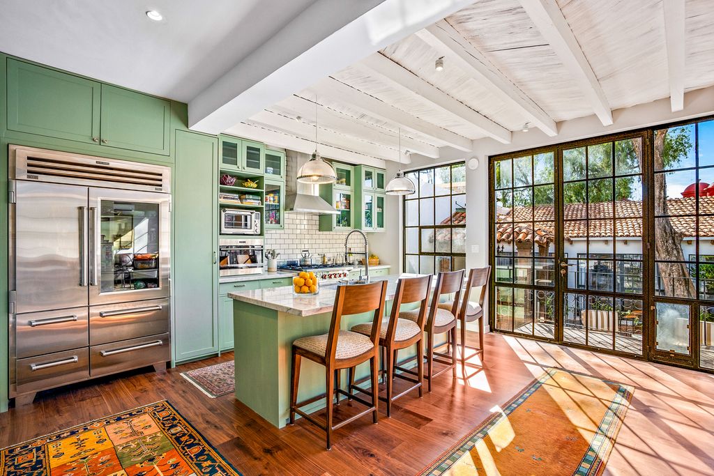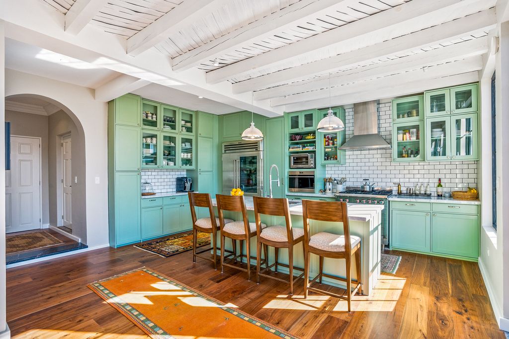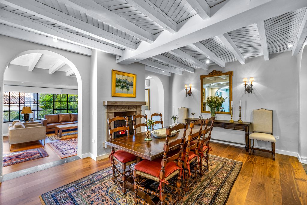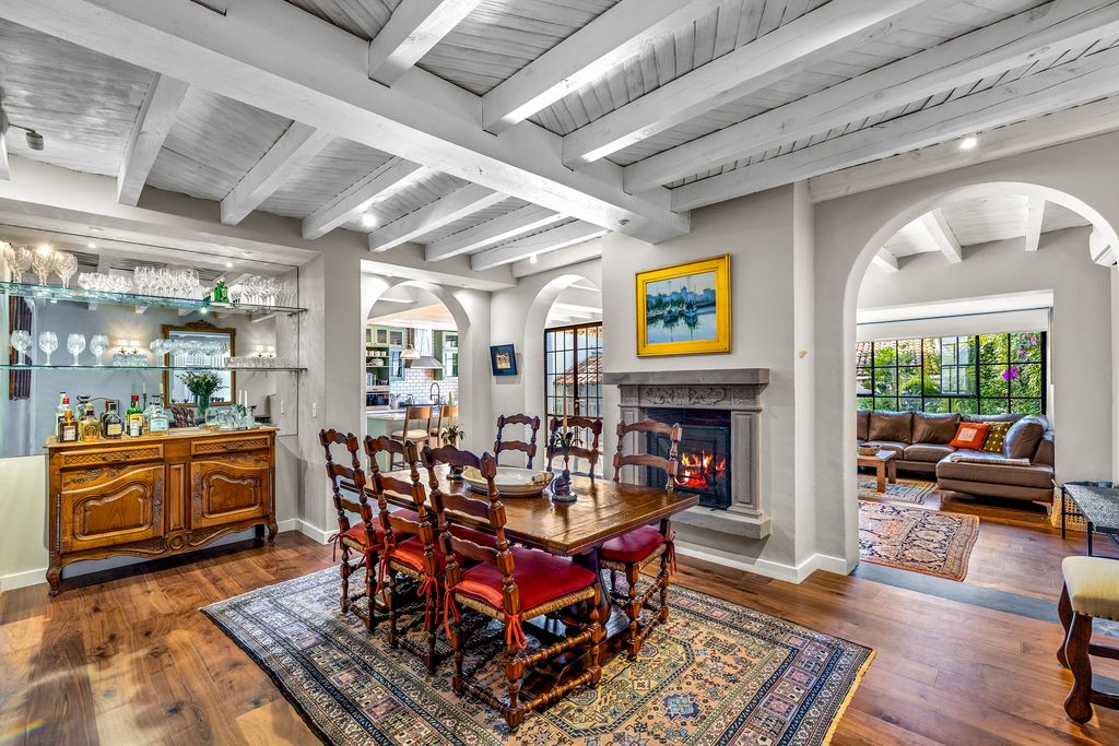 The formal dining room, anchored by a carved stone fireplace and warm wood floors, flows naturally into inviting living areas that overlook the gardens. The gourmet kitchen is a showpiece, designed with sage-toned custom cabinetry, high-end appliances, and a spacious island, opening directly onto a sunlit terrace for effortless indoor-outdoor living.