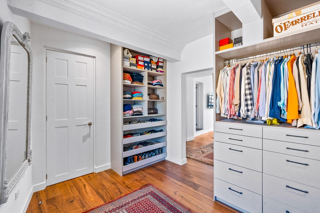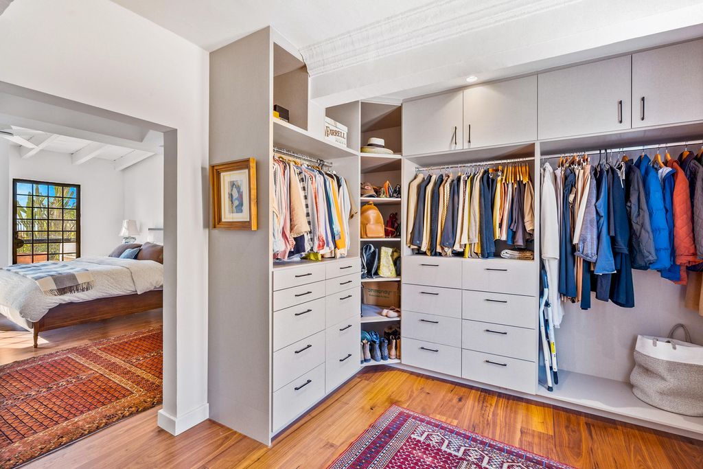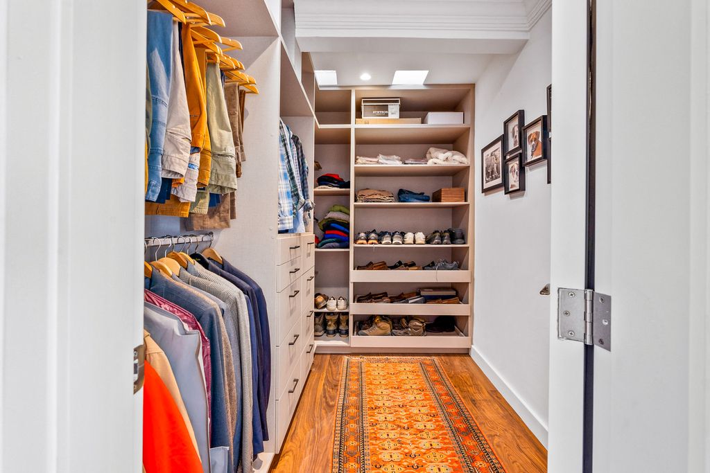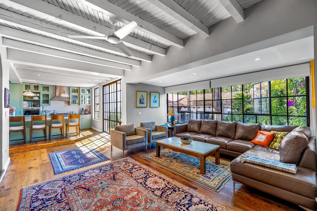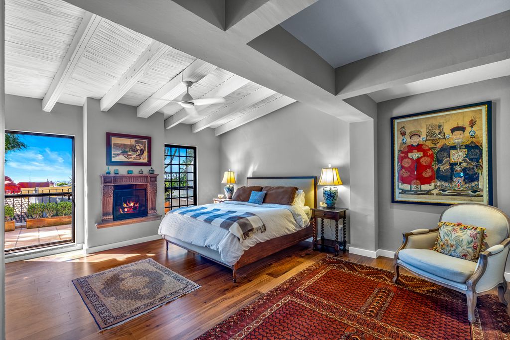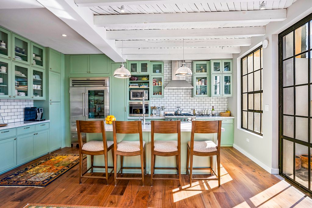 The formal dining room, anchored by a carved stone fireplace and warm wood floors, flows naturally into inviting living areas that overlook the gardens. The gourmet kitchen is a showpiece, designed with sage-toned custom cabinetry, high-end appliances, and a spacious island, opening directly onto a sunlit terrace for effortless indoor-outdoor living.