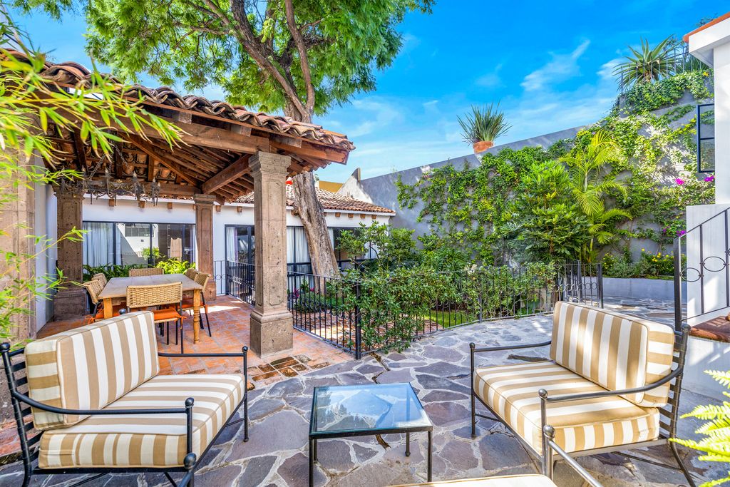 Located on Calle Barranca in Centro, this exceptional residence seamlessly blends colonial elegance with modern comfort. Recently renovated, it features whitewashed beamed ceilings, graceful French windows, arched passageways, and expansive interiors flooded with natural light. The result is a captivating ambiance of openness and tranquility, just minutes from El Jardín, the vibrant heart of the city.