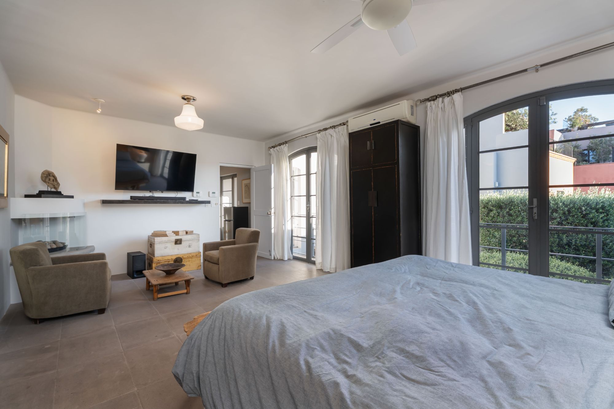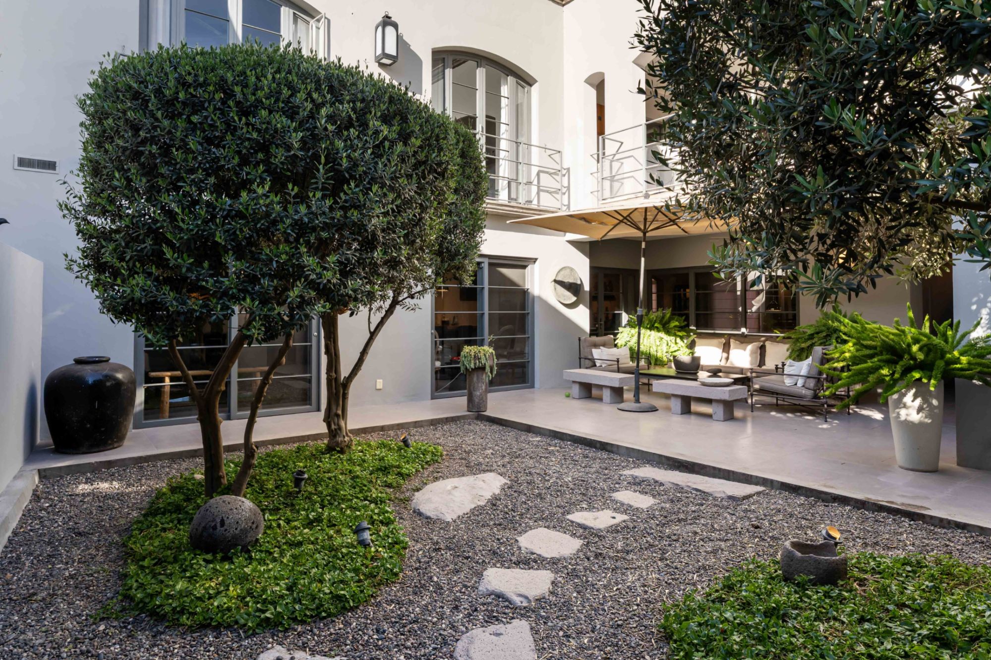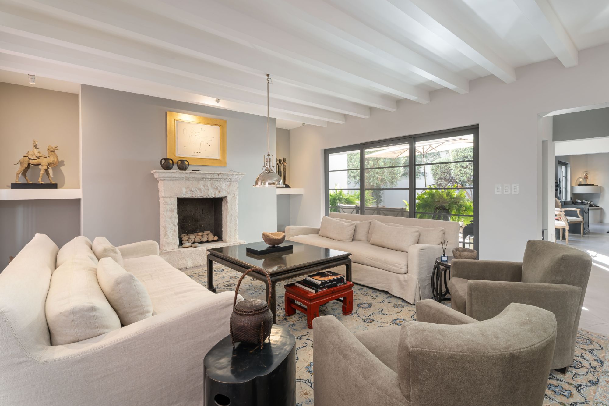 level hosts three light-filled bedrooms—each with its own ensuite bathroom—as well as a spacious office. The serene primary suite offers a fireplace and direct courtyard outlook, creating a private retreat of exceptional calm.