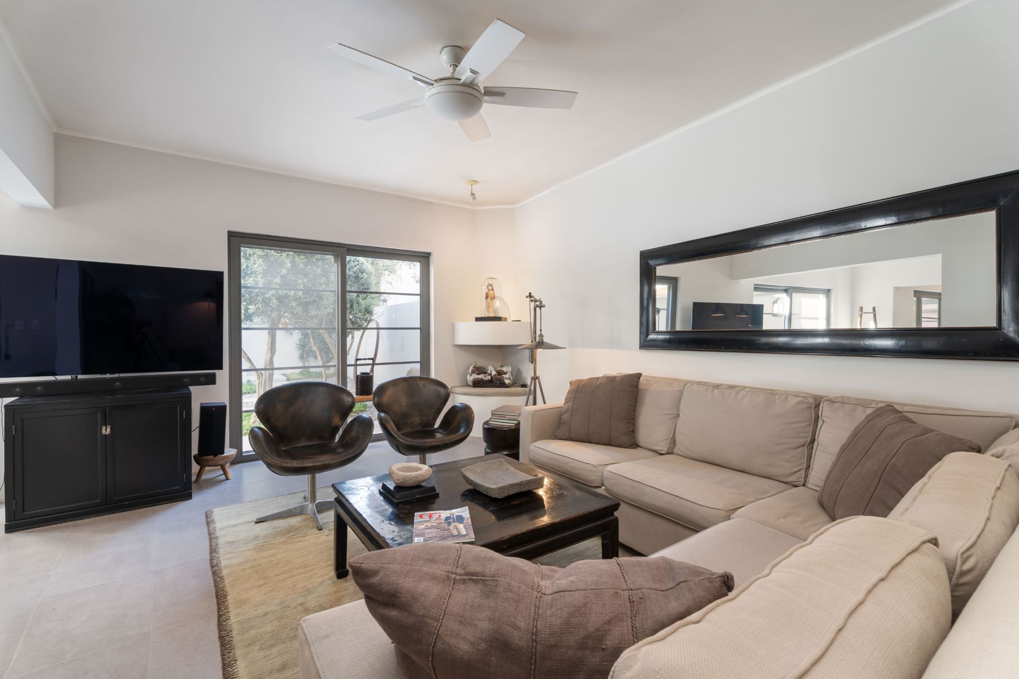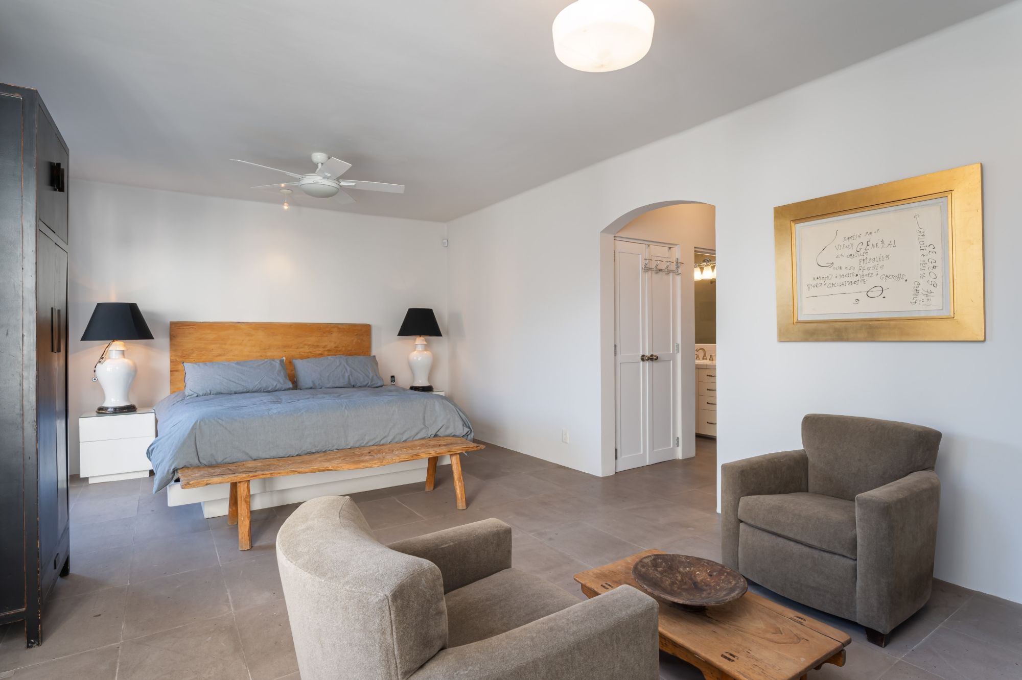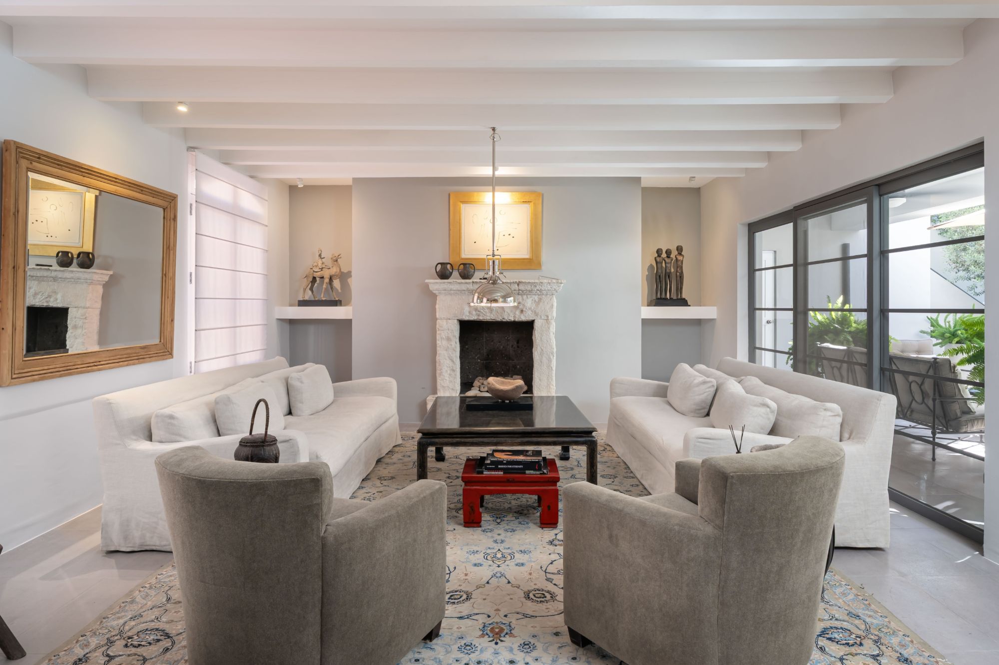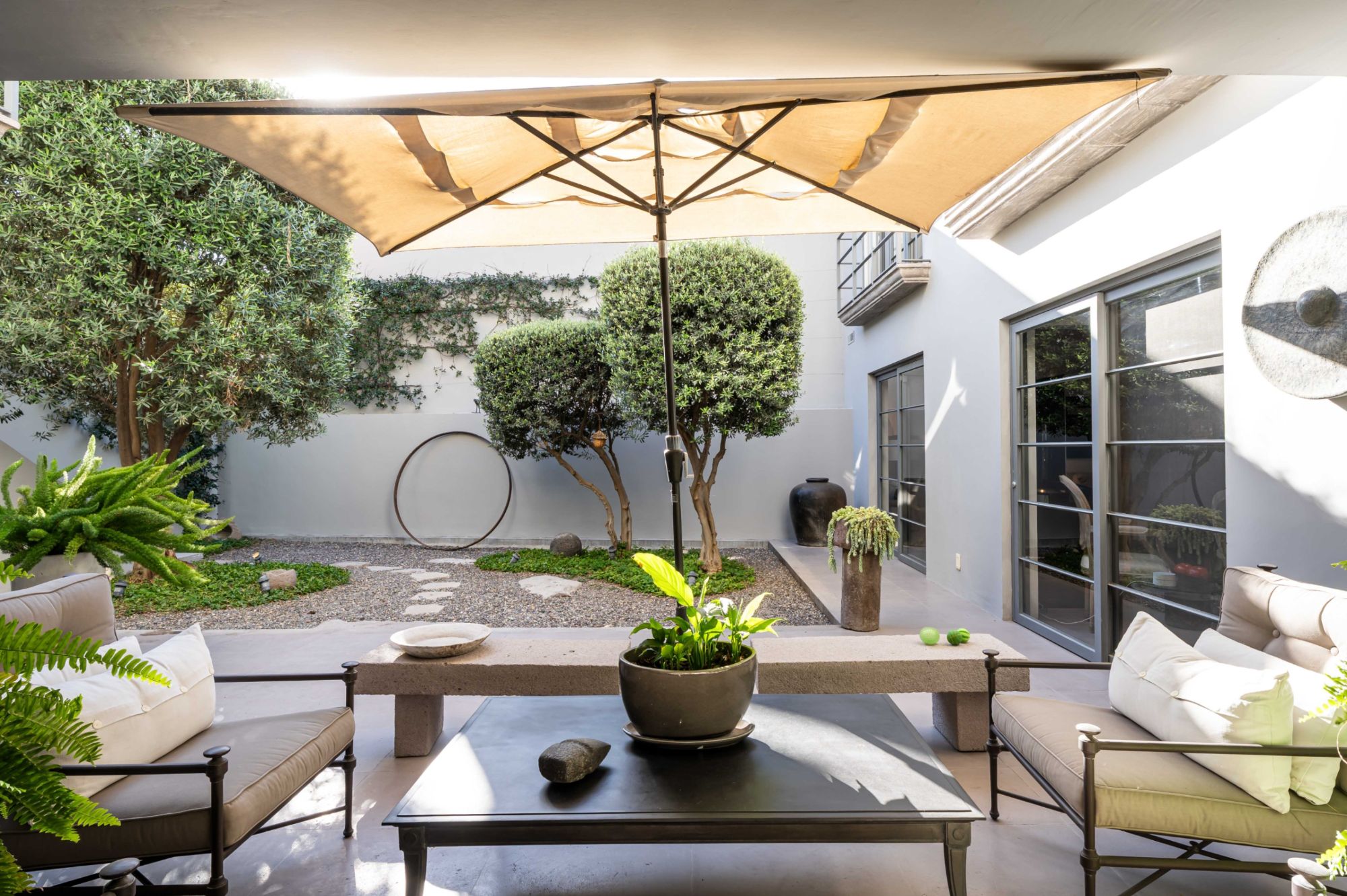level hosts three light-filled bedrooms—each with its own ensuite bathroom—as well as a spacious office. The serene primary suite offers a fireplace and direct courtyard outlook, creating a private retreat of exceptional calm.