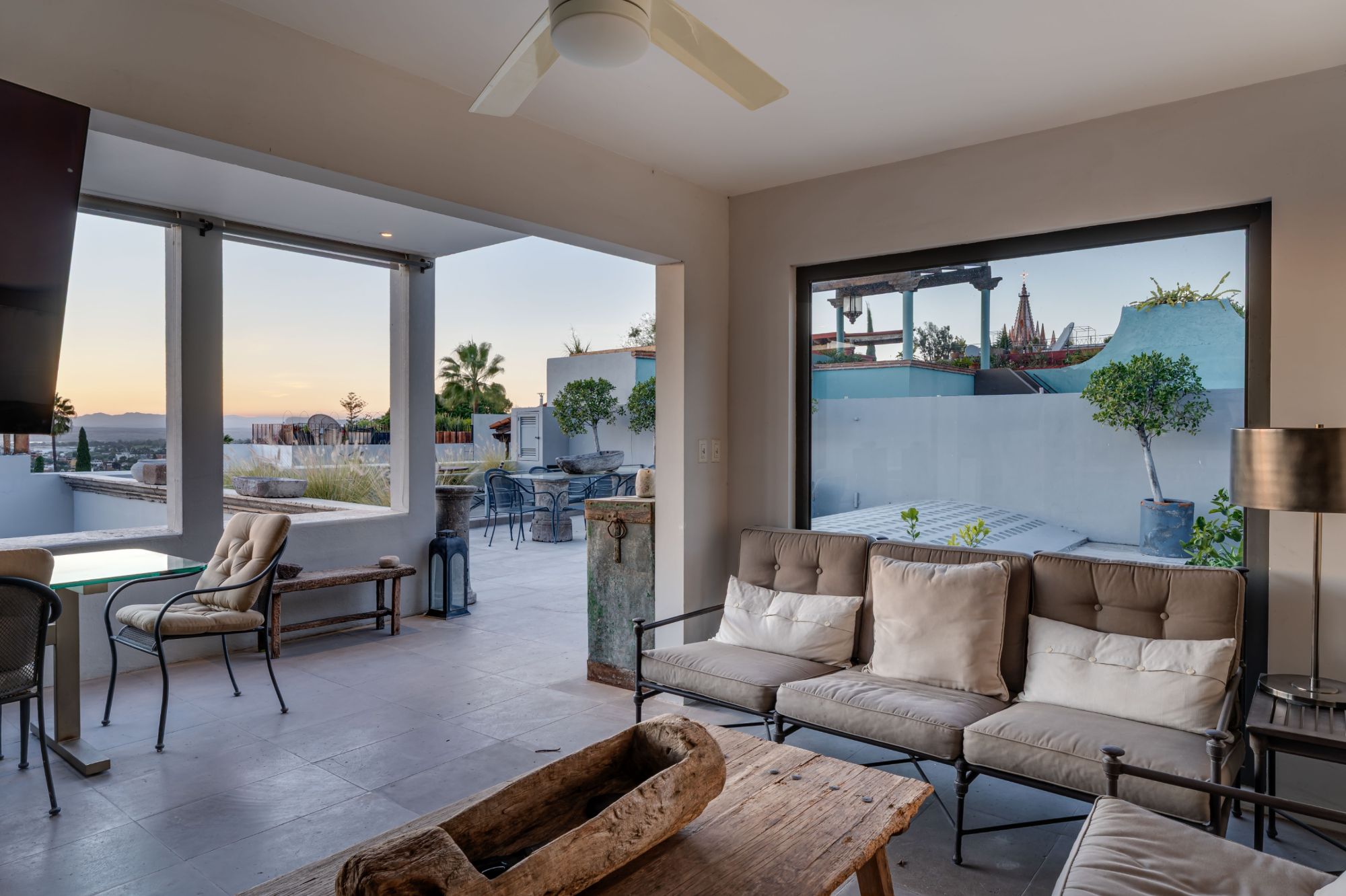 The uppermost level reveals a spectacular indoor–outdoor living and entertaining space with a full bath, fireplace, and sweeping views across the valley and toward the sunset. A cozy covered sitting area opens onto a large terrace with iconic Parroquia vistas—an unforgettable setting for gatherings or quiet evenings.
