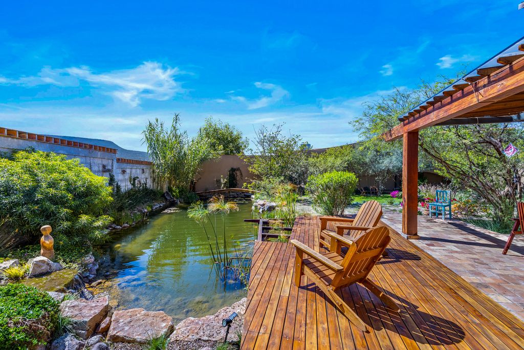 Pond with oxygenation system, biofilters, and waterfall.