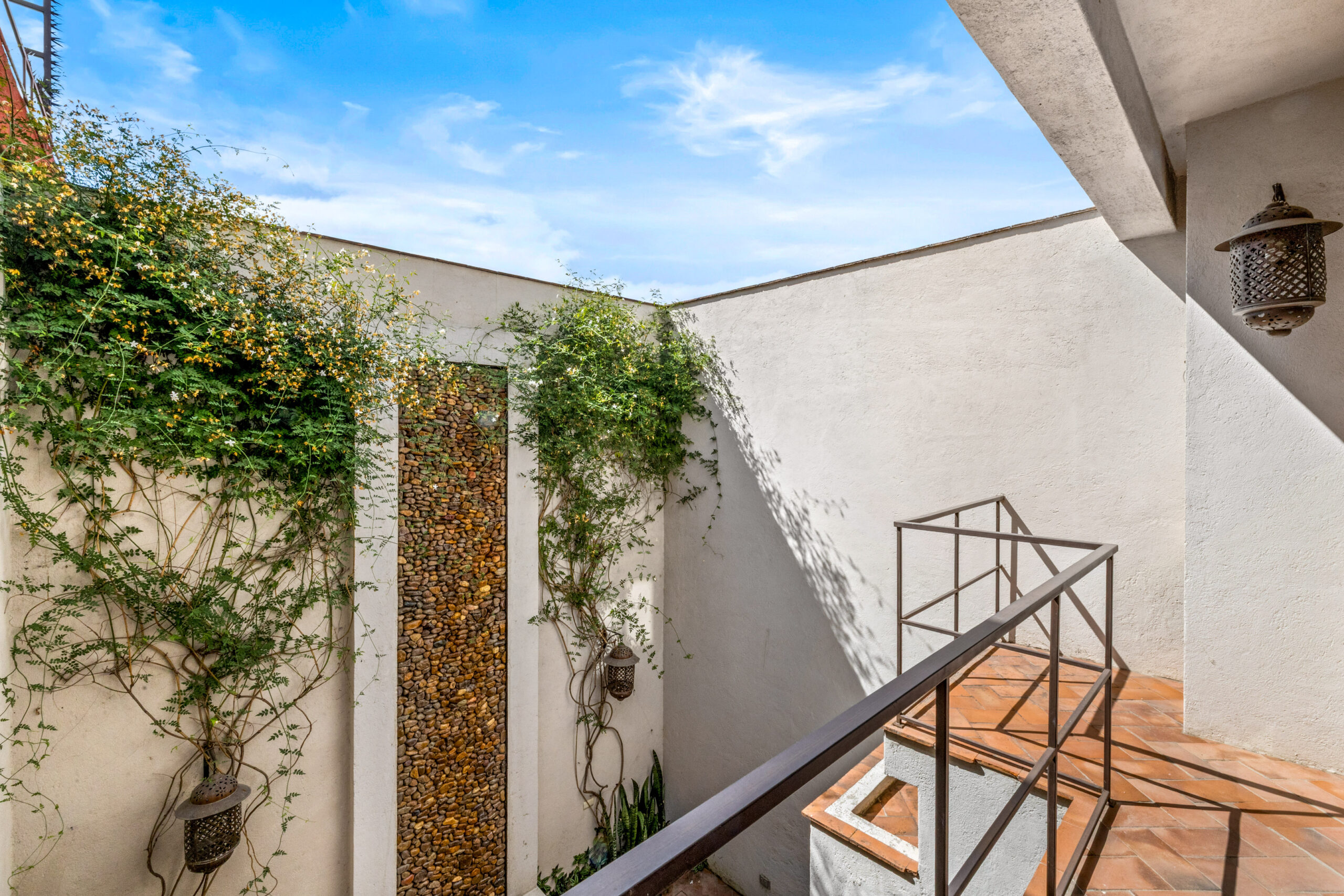 A floating staircase leads to the 2nd floor bedroom—considered the primary suite, replete with French doors —and light-filled media room with fireplace and balcony overlooking the courtyard, easily used as a 3rd sleeping room with a convertible sofa bed. The 3rd floor then boasts a small office landing off the staircase, large laundry area, and second bedroom replete with its own large terrace facing the church. All bedrooms boast fireplaces, with three total in the home.