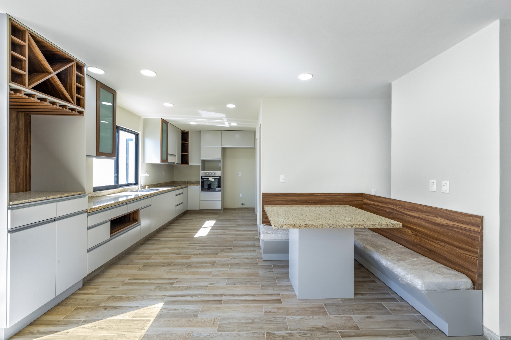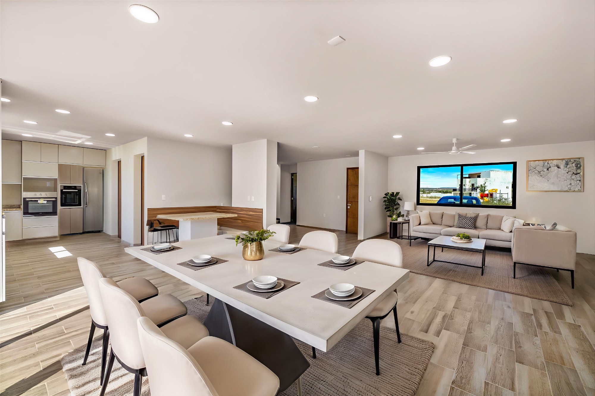 The main entrance opens into a large living room that flows seamlessly into the dining area and a spacious, functional kitchen equipped with cabinetry, a granite countertop, and a comfortable built-in breakfast nook. Floor-to-ceiling sliding windows connect to the patio, allowing for a smooth transition between indoor and outdoor spaces, filling the home with light and creating an ideal atmosphere for gatherings.