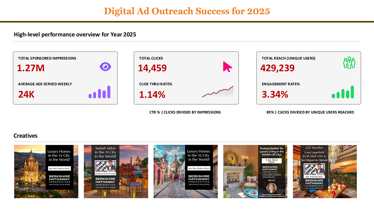 So does our digital outreach prove successful at selling your home faster, for a better price? Look at the delivery statistics at left. Over 24,000 potential clients see our digital ads EVERY week! Over 400K clients then actually engage with us on our web site, often contacting us so we have a new client contact, or asking specifically about a posted listing. That gives us an above-industry-average engagement rate, meaning your home is indeed sold faster, and for a better price with us! And while we continue to do print advertising—yes, it is more visceral—we provide you far better outreach to clients with our digital ad campaigns. Remember, we are the ONLY real estate agency in San Miguel de Allende able to offer this to our clients!